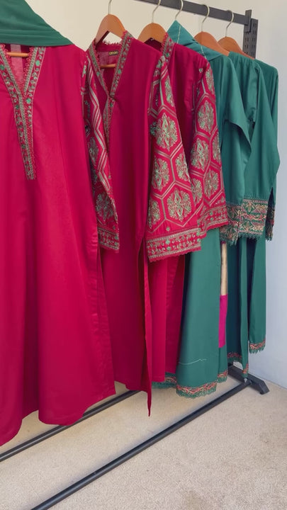 gned for understated elegance. Crafted from a soft winter fabric, the outfit features subtle embroidery along the neckline and sleeves, adding depth without overpowering the look. The clean, straight silhouette is paired with matching trousers, while a contrasting dark green dupatta completes the ensemble with quiet sophistication. Ideal for those who appreciate minimal design with a luxurious finish.