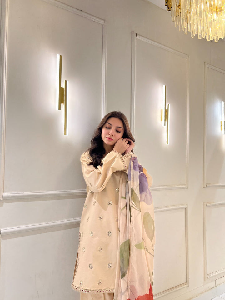 Stay stylish and comfortable with Sahara Grace — a 3-piece viscose suit designed for everyday elegance. The beige shirt with light embellishments pairs perfectly with wide-leg trousers, while the pastel-printed dupatta adds a refreshing touch. Made from breathable viscose, this outfit is perfect for casual wear, semi-formal events, or festive evenings.
